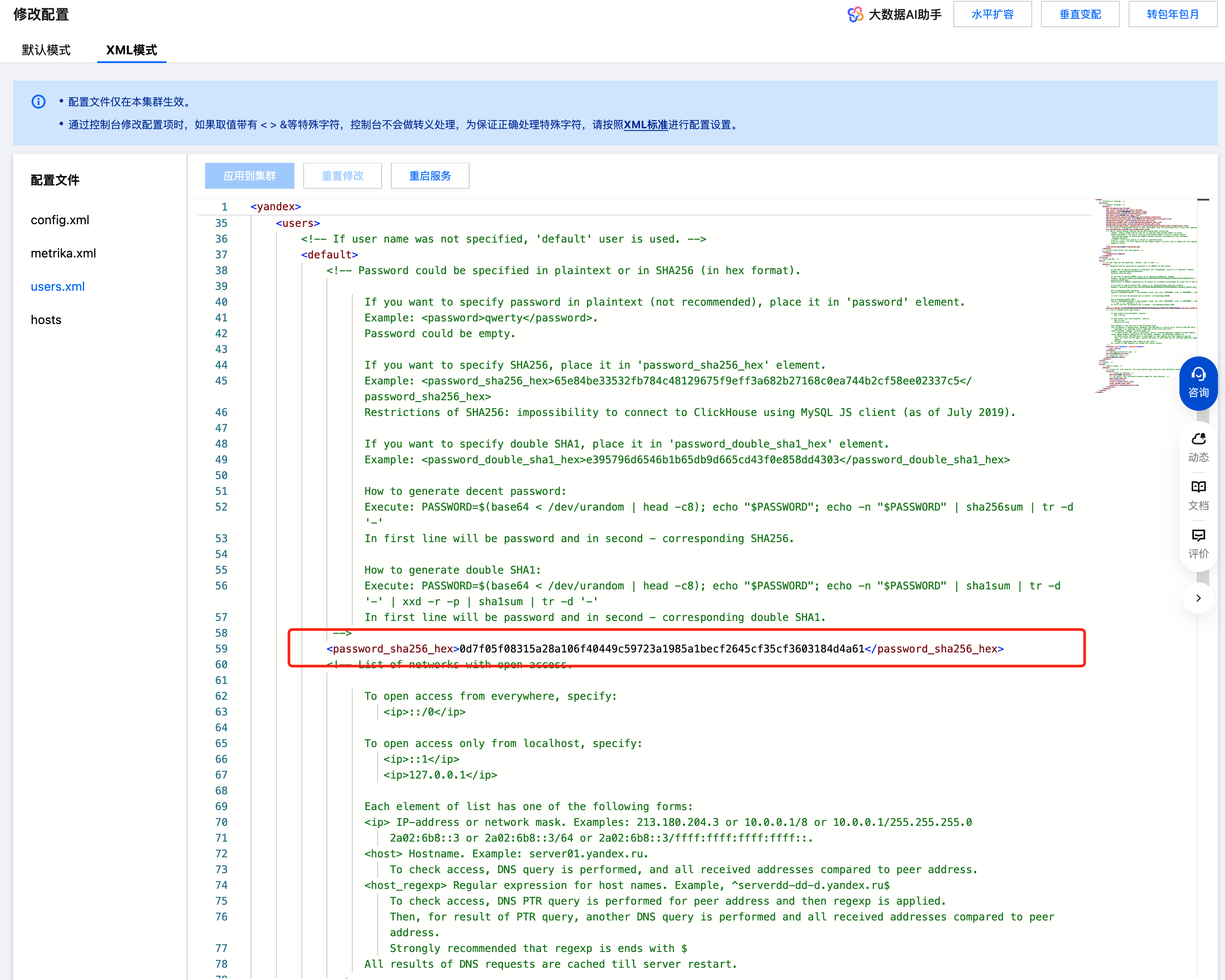 XML 账户是在 users.xml 配置文件里定义的用户,创建集群时会默认创建名为 default 的 XML 账户,其密码由用户在创建集群时指定,可自行在 user.xml 中进行修改。
