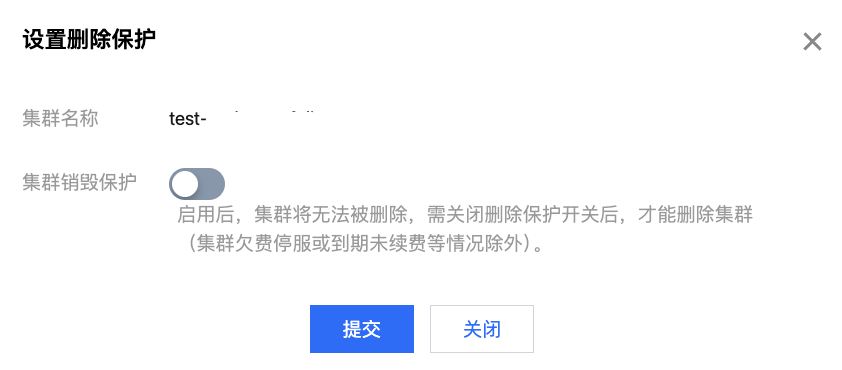 开启集群销毁保护开关后,集群将无法通过控制台或者 API 被删除,如需销毁集群,您需要先手动关闭销毁保护开关,才能执行集群的销毁操作。建议对关键业务长期开启此保护开关。