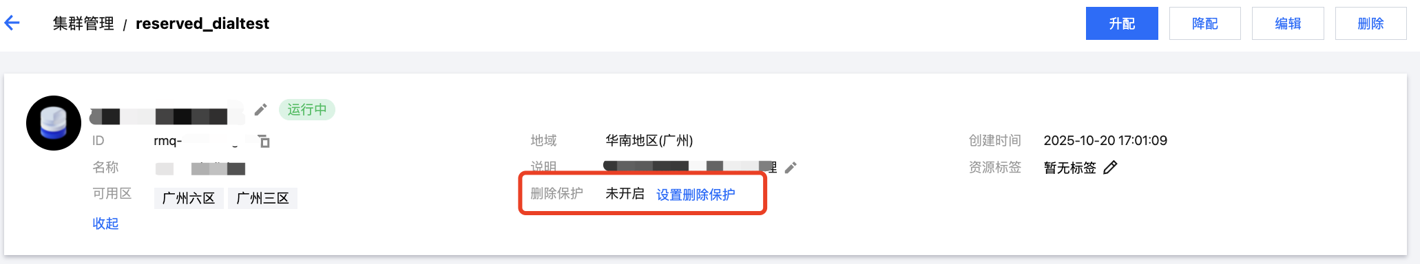中点击目标集群的“ID”,进入集群基本信息页面,在集群详情模块找到删除保护开关。