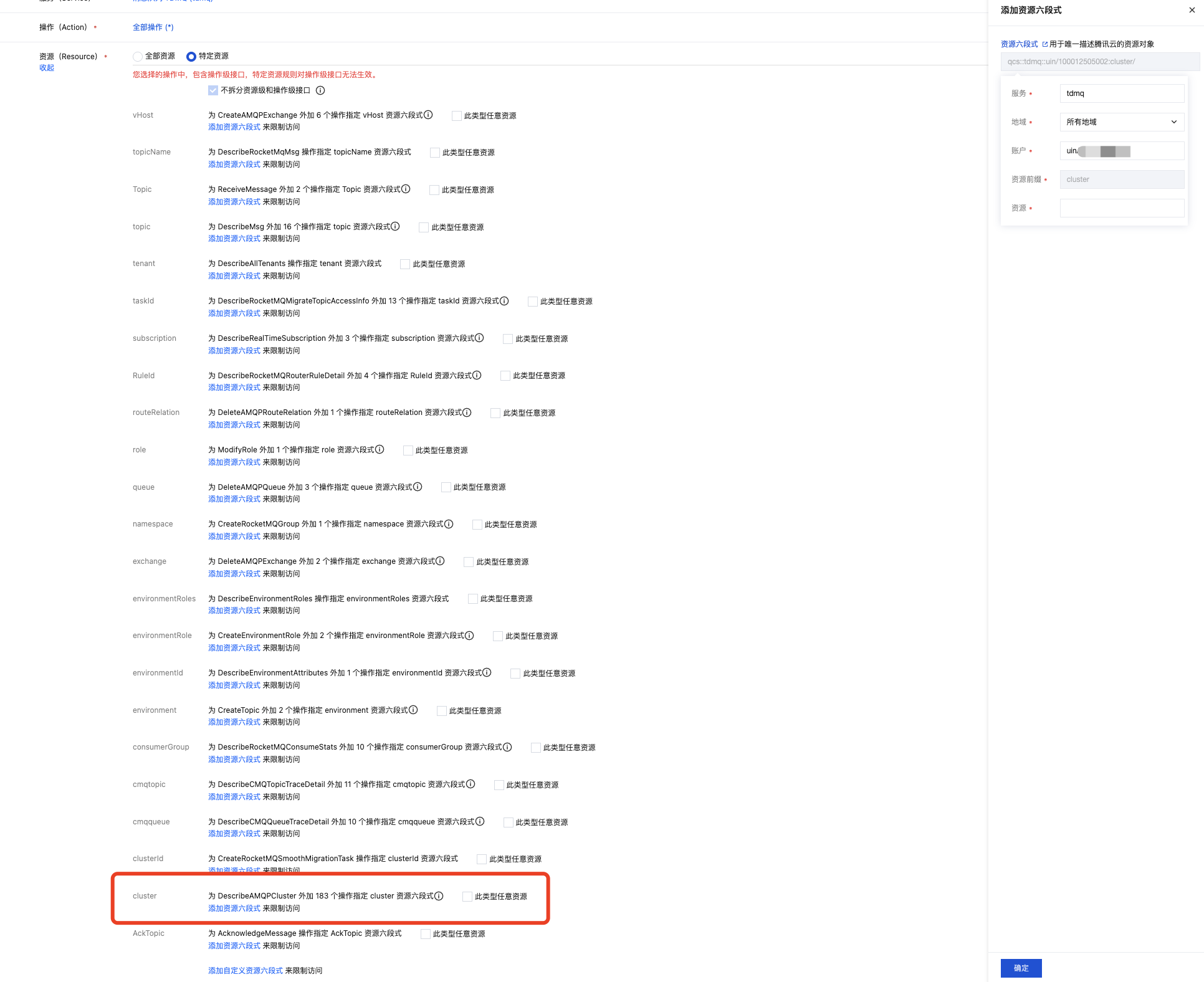 5. 在资源(Resource)中选择特定资源,找到 cluster 资源类型,您可以勾选右侧此类型任意资源(授权所有集群资源),或者单击添加资源六段式(授权特定集群资源),在弹出的侧边对话框中的资源中,填入集群的 ID。