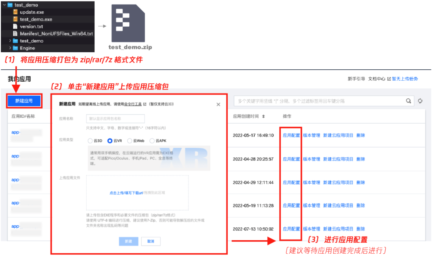 2. 将应用压缩打包为 ZIP / RAR / 7z文件,在 我的应用 处上传压缩包,选择云VR应用类型。
