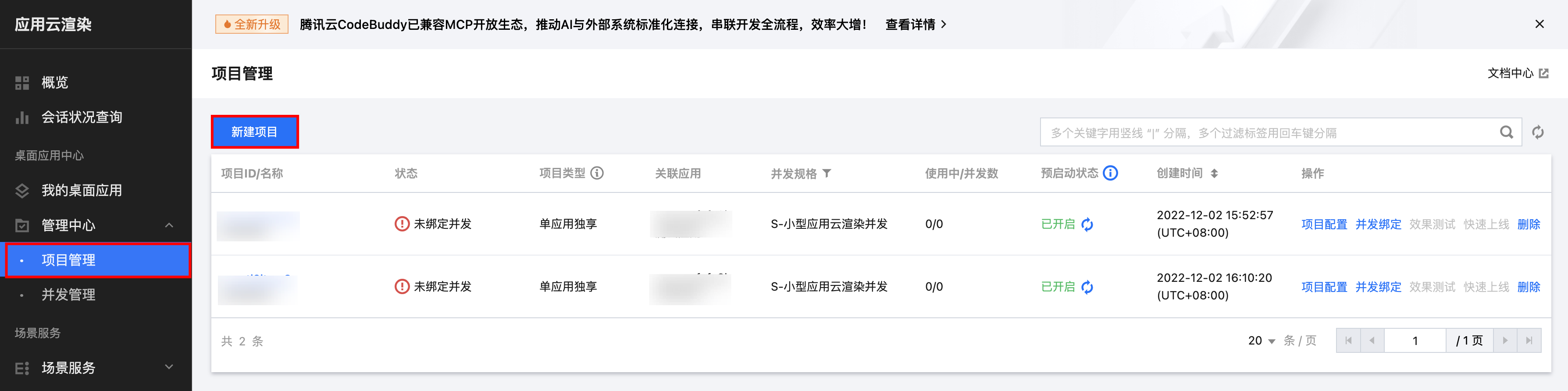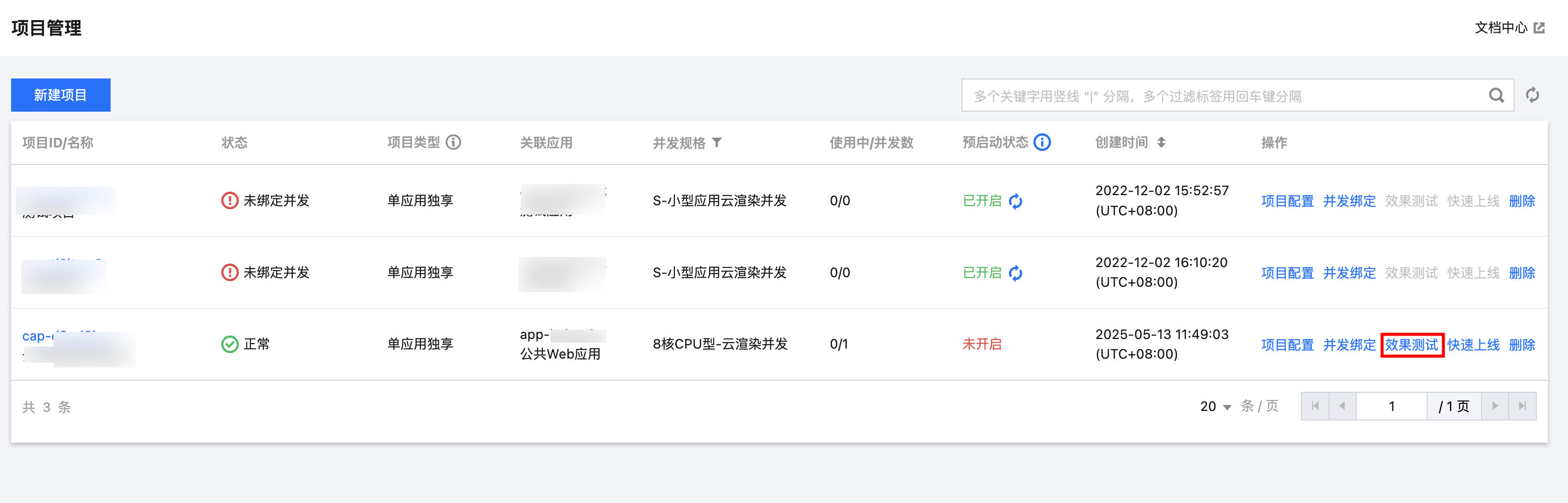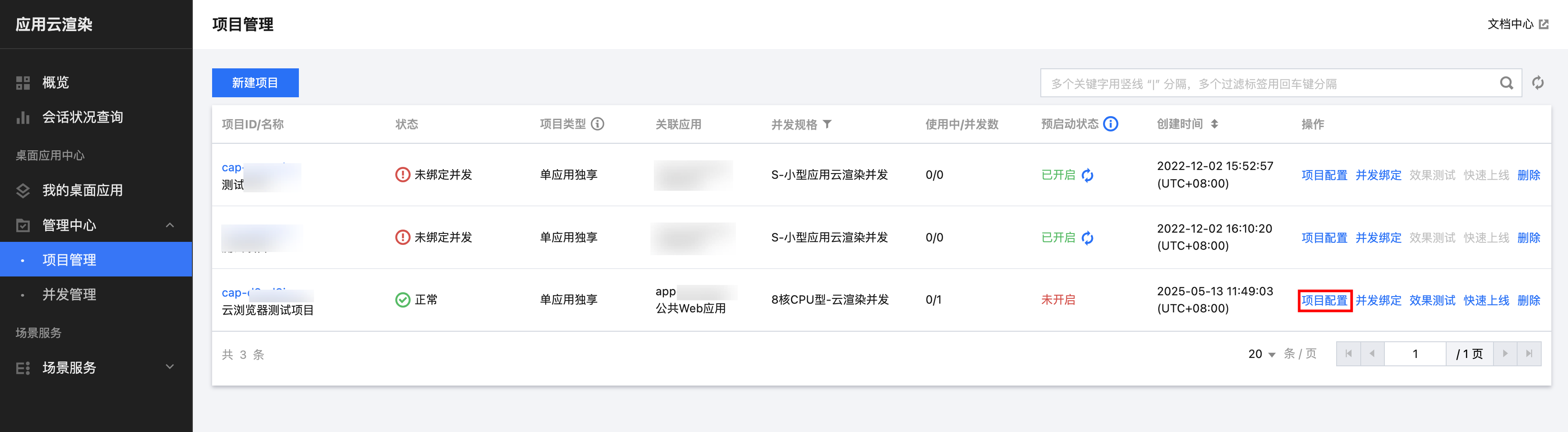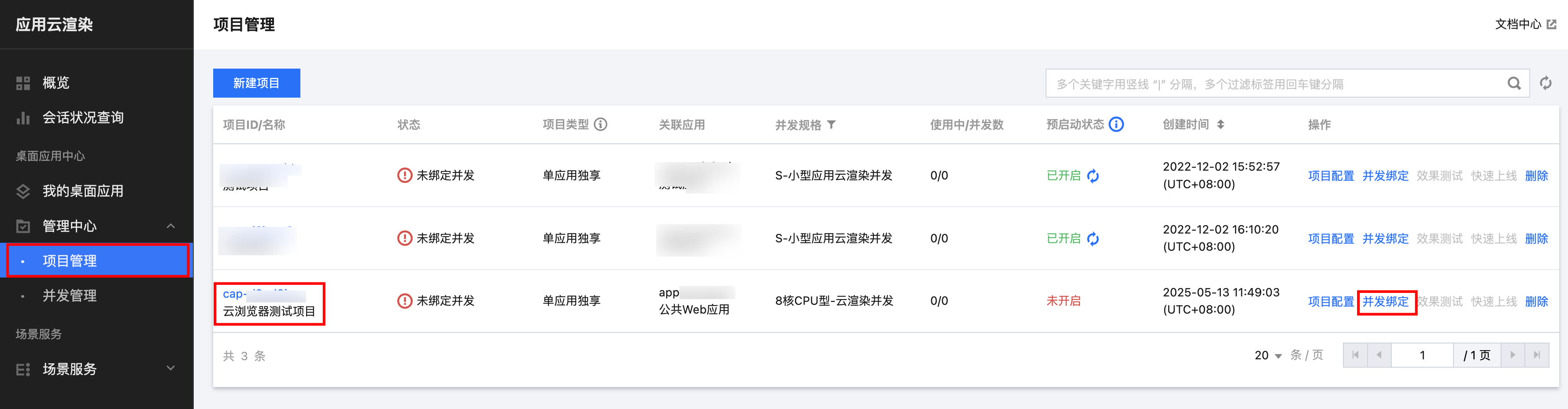 1. 在 应用云渲染控制台 > 项目管理,选择刚刚创建的项目,在操作处单击并发绑定。如下图所示:
