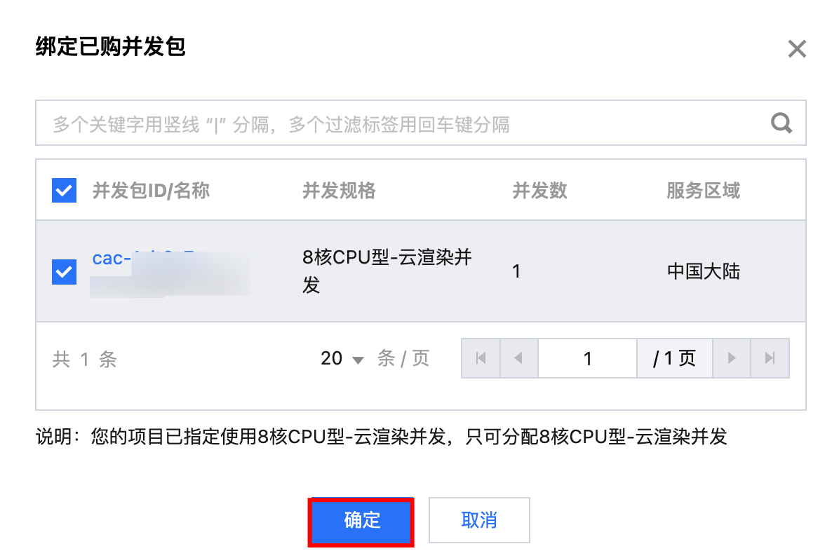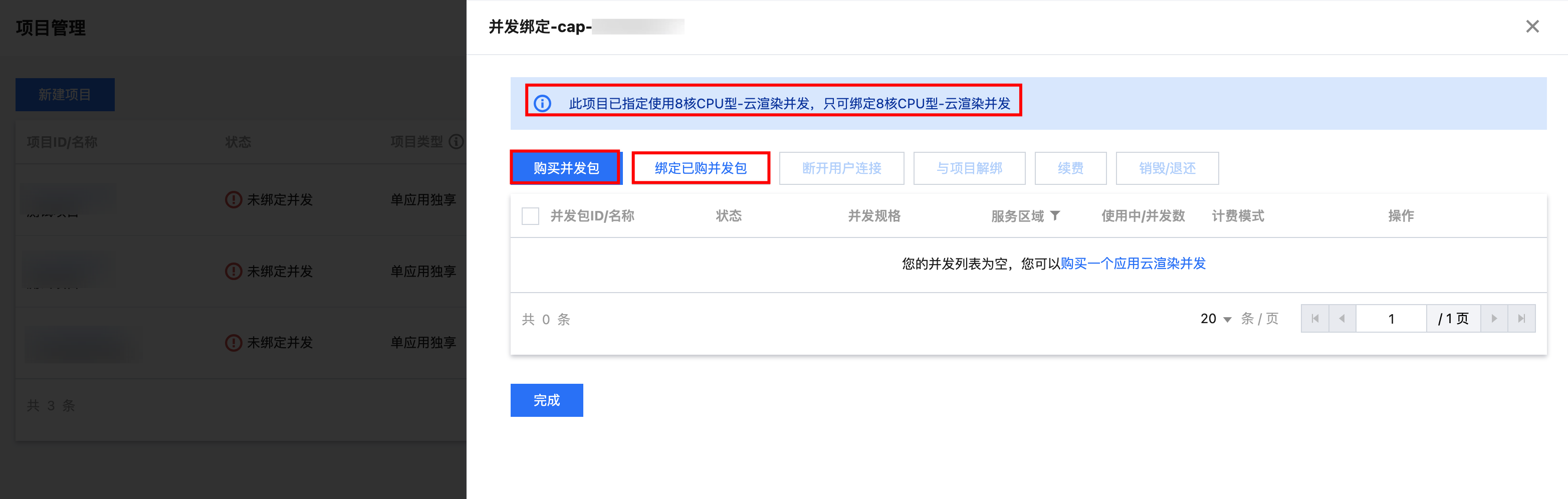 2. 在弹出的并发绑定界面进行并发绑定设置。按照刚刚创建项目时并发规格设置绑定并发包,单击购买并发包或者绑定已购并发包,示例账号已经购买了 8 核 CPU 型-云渲染并发,因此单击绑定已购并发包。如下图所示: