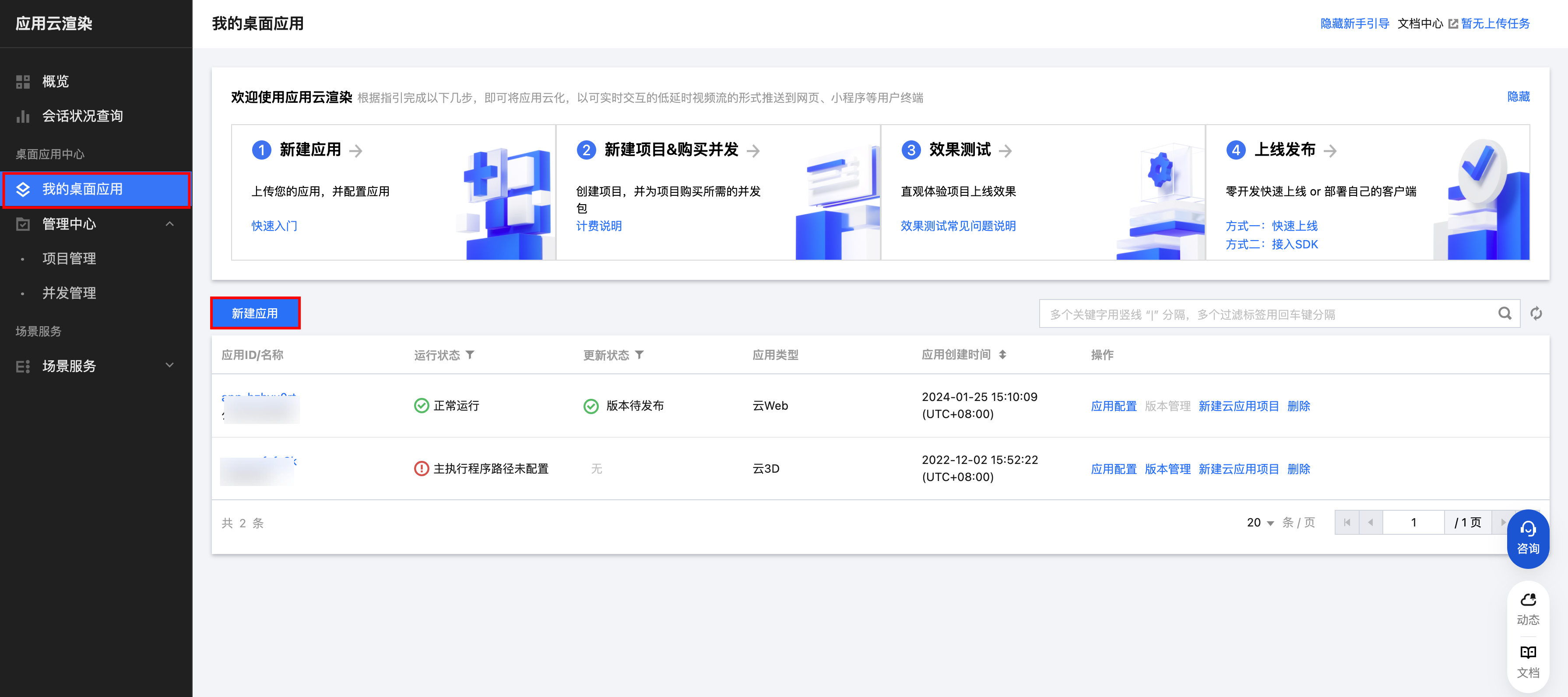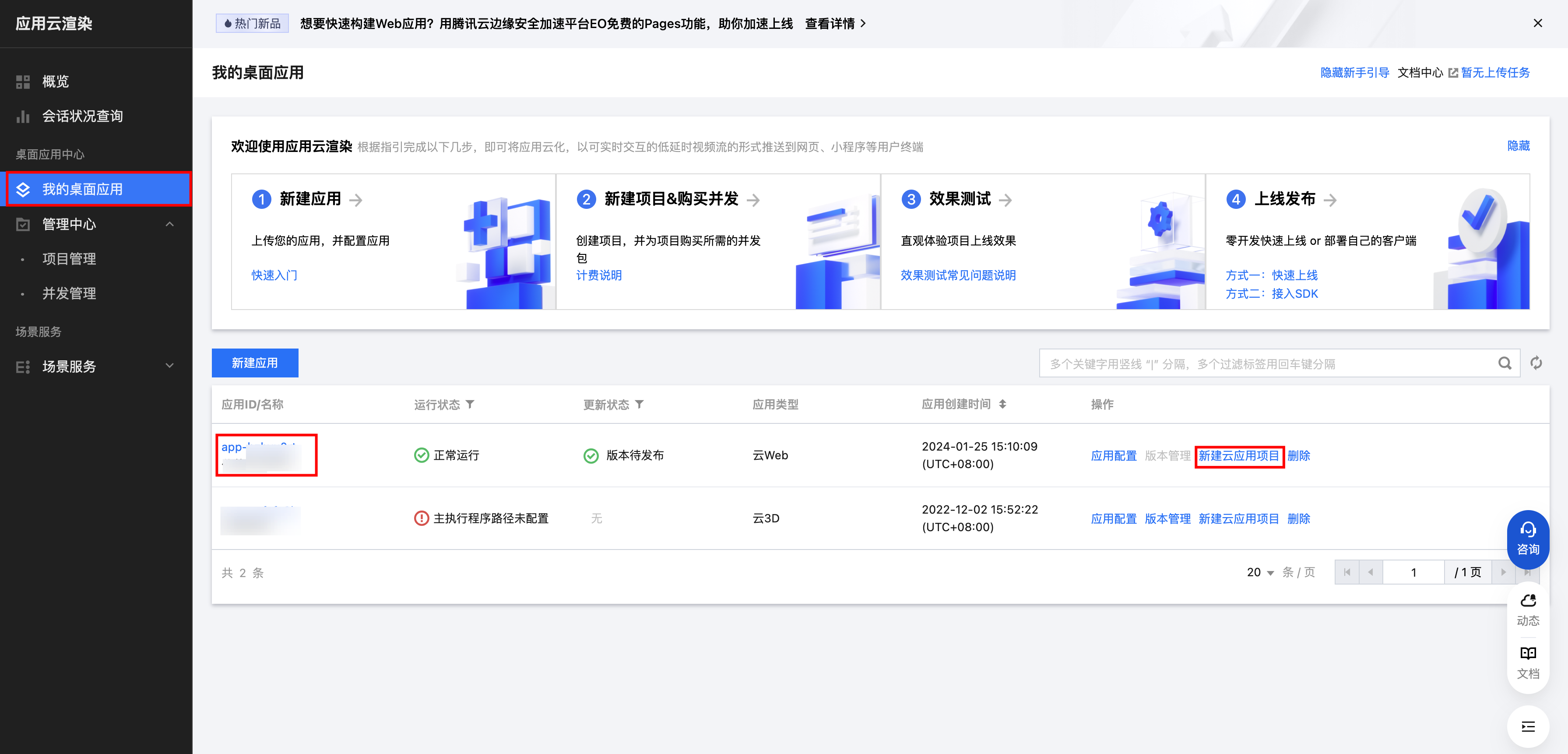 1. 在 应用云渲染控制台 > 我的桌面应用页面,选择刚刚获取的云 Web 应用,在操作处单击新建云应用项目。如下图所示: