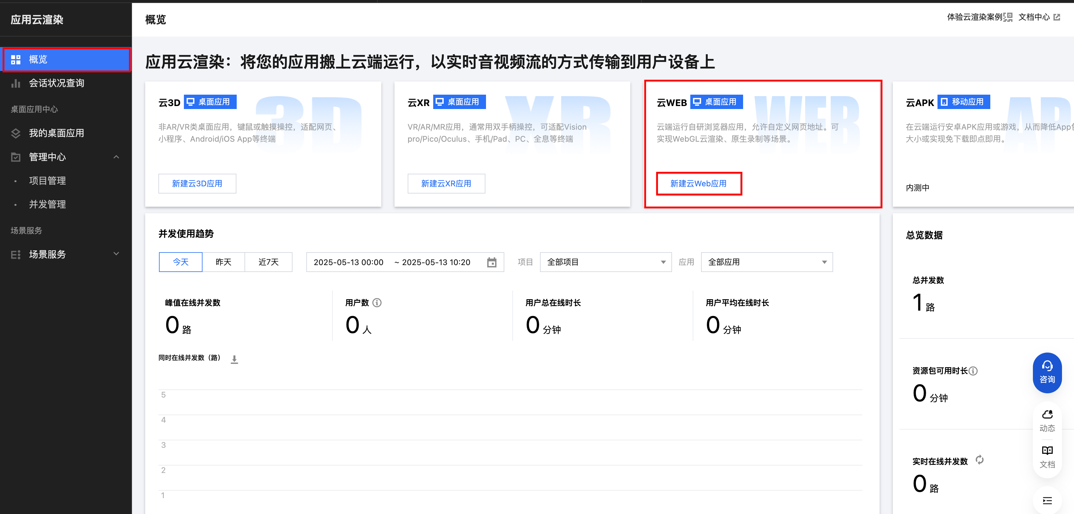 1. 在 应用云渲染控制台 处进入概览页面,选择云 WEB 界面,单击新建云 Web 应用,如下图所示: