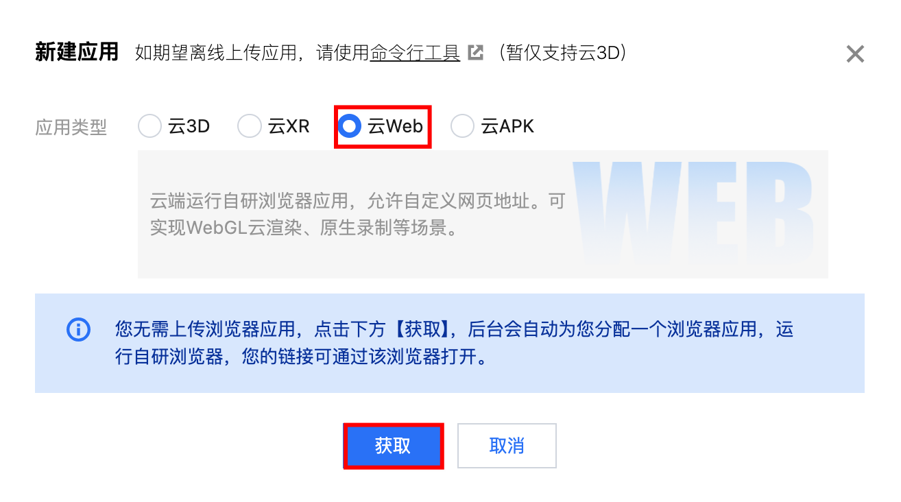 2. 在弹出的新建应用窗口,在应用类型处选择云 Web,单击获取,即可获取到分配的云浏览器应用。如下图所示: