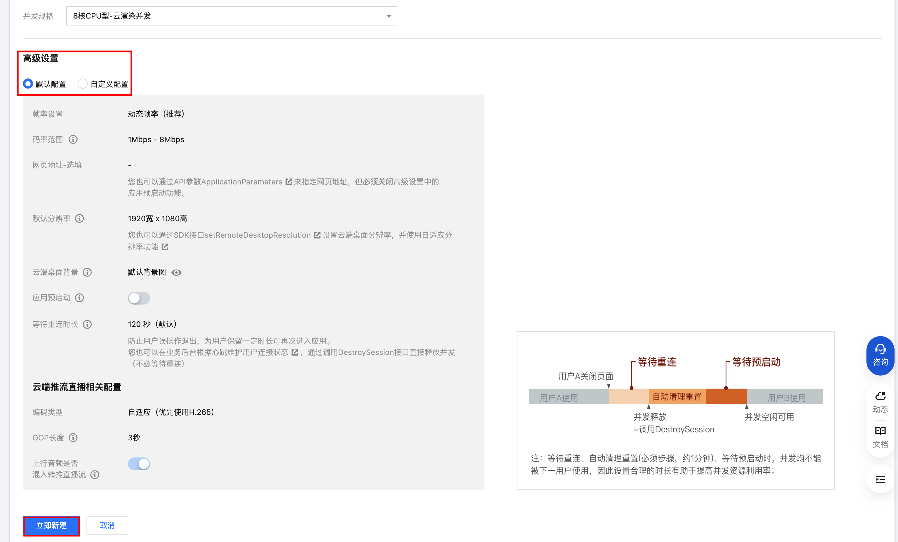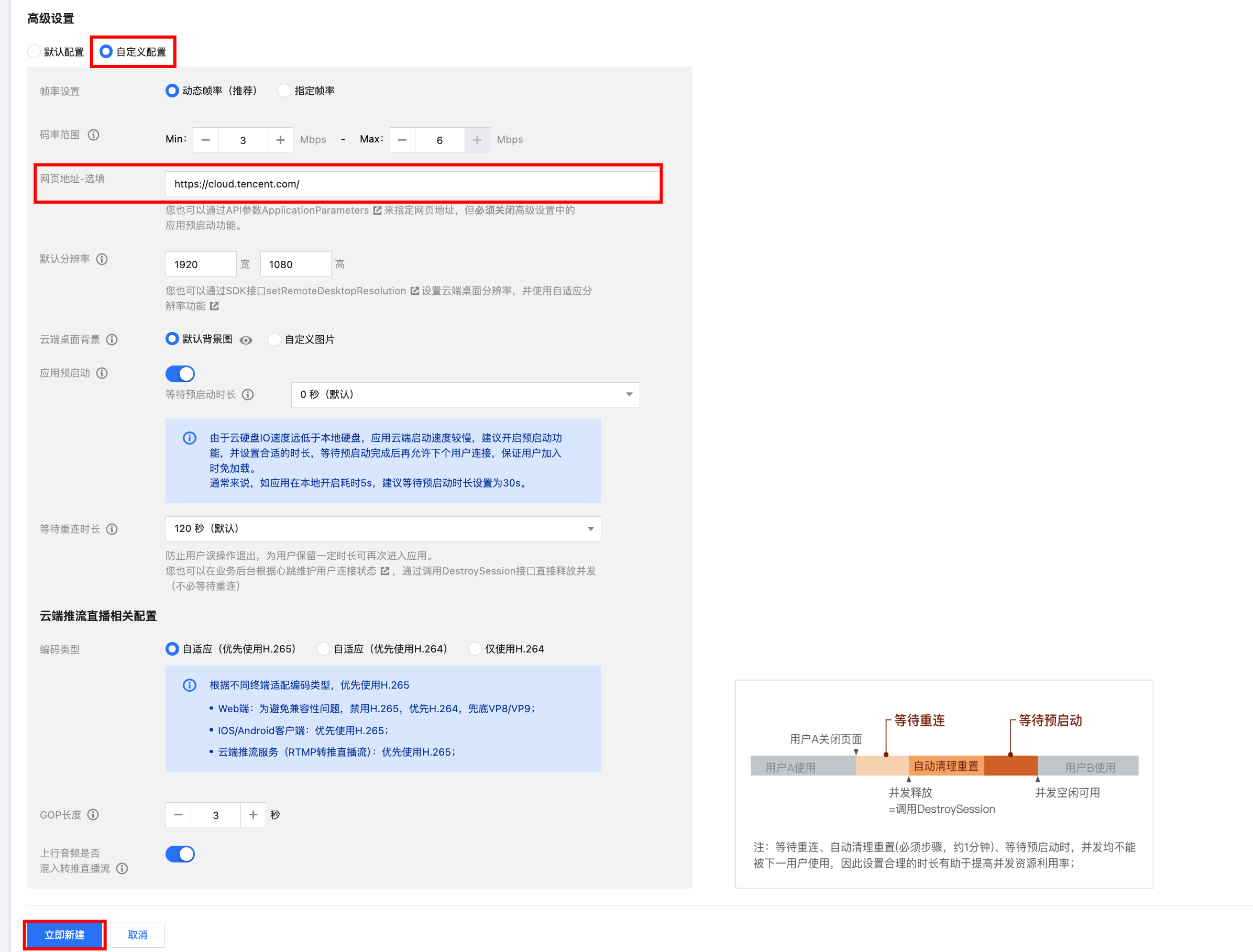 3. 根据需要在高级设置处选择自定义配置,在网页地址处填入我们想登录的网页地址,本文档以腾讯云地址示例(https://cloud.tencent.com/),填好网页地址后单击立即新建。