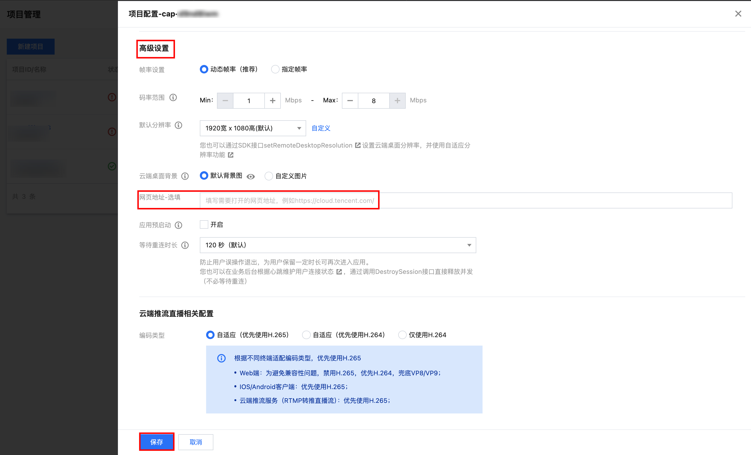 2. 在项目配置界面,高级设置处,填写或修改想要打开的网页地址。本文档以腾讯云地址示例(https://cloud.tencent.com/),填好网页地址以后,单击保存。如下图所示: