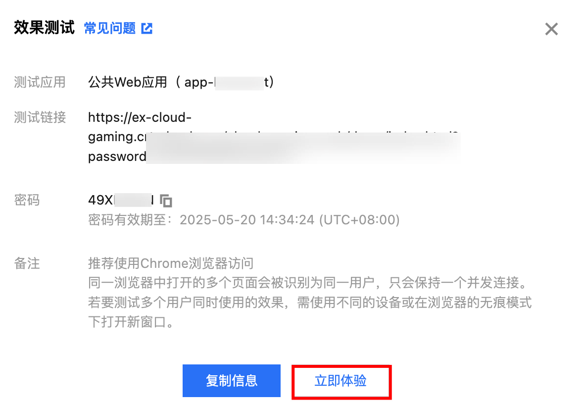 4. 在弹出的效果测试页面,单击立即体验。如下图所示:
