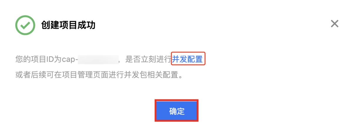 4. 创建项目成功页面,单击超链接并发配置进入并发绑定界面,或者单击确定,后续进行并发包相关配置。如下图所示: