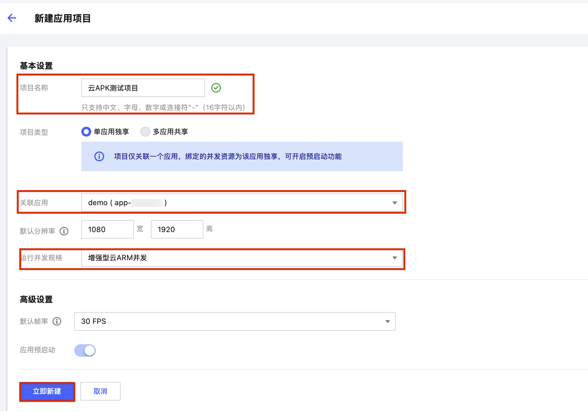 1. 在弹出的新建应用项目页面,进行项目基本设置: