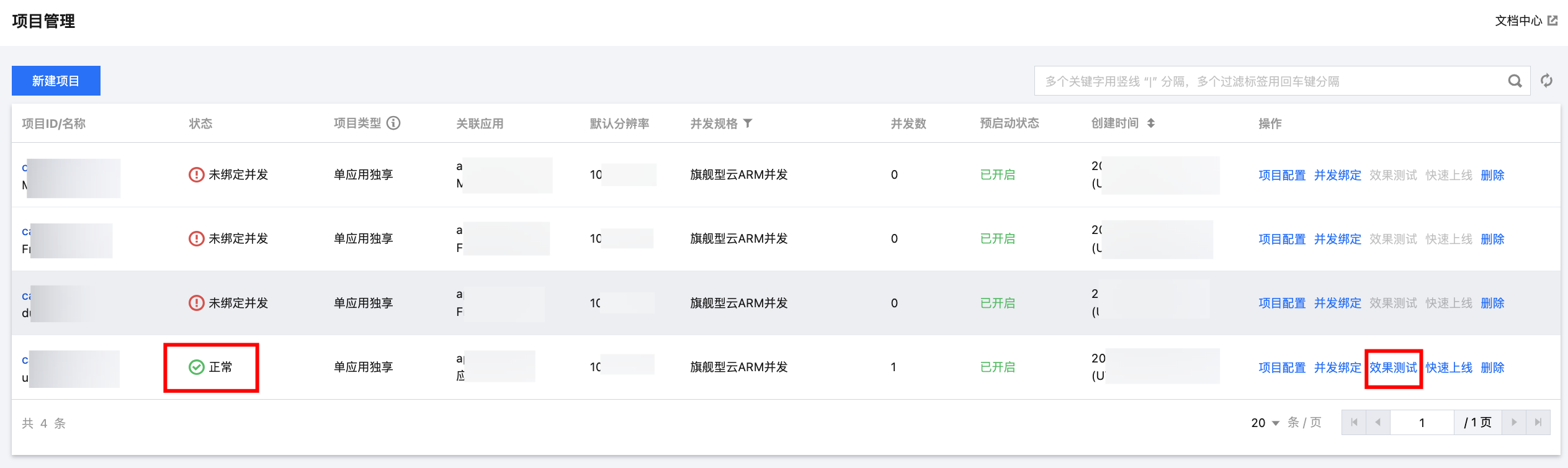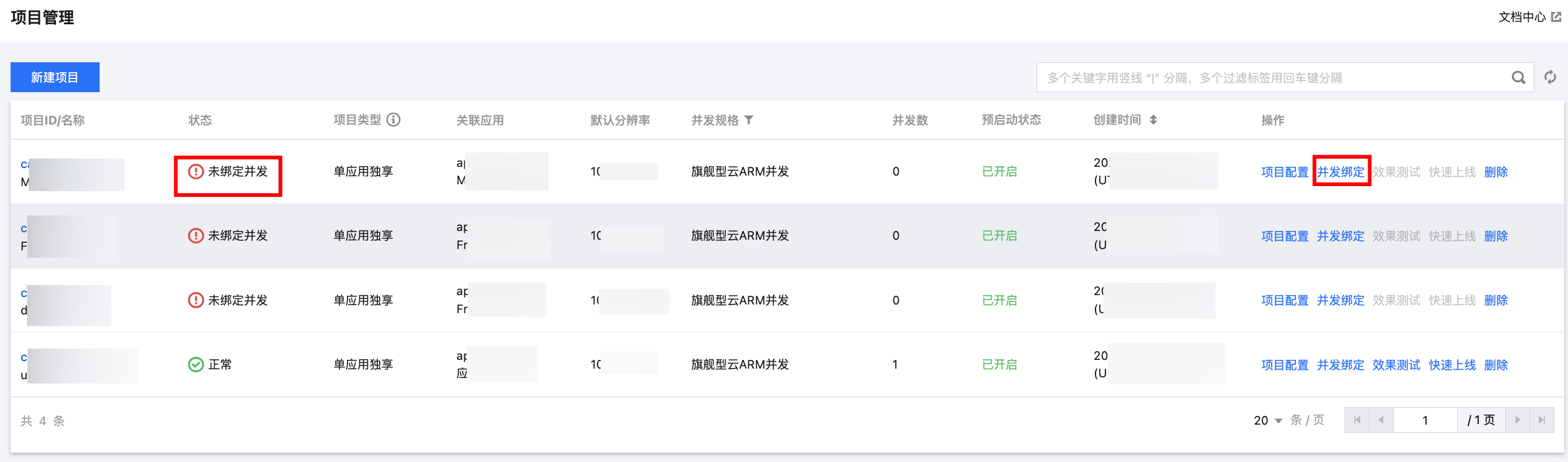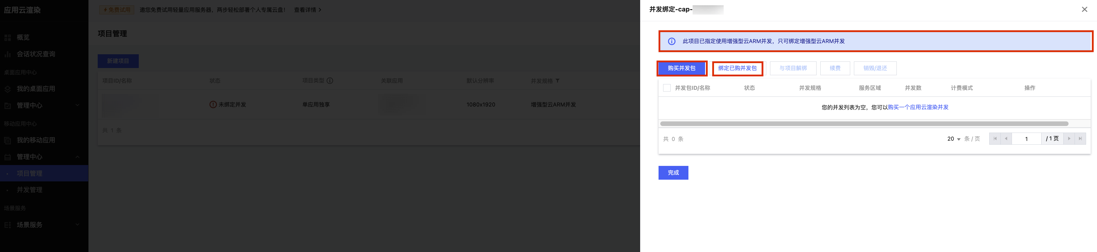 1. 在 应用云渲染控制台 > 移动应用中心 > 管理中心 > 项目管理,选择刚刚创建的项目,在操作处单击并发绑定。如下图所示: