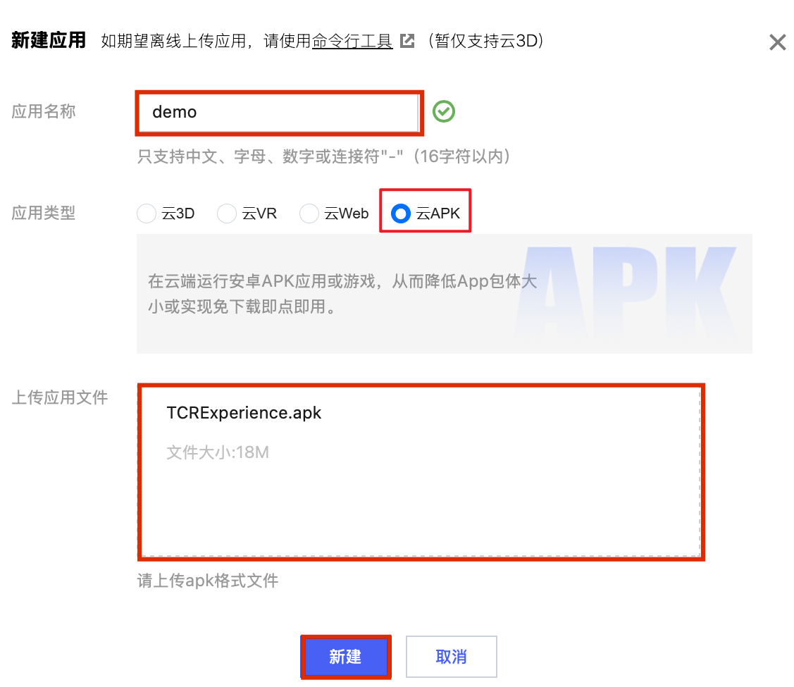 2. 在弹出的新建应用窗口,填写应用名称,在应用类型处选择云APK,根据需求上传应用文件后(本文档上传示例应用 APK),单击新建。如下图所示: