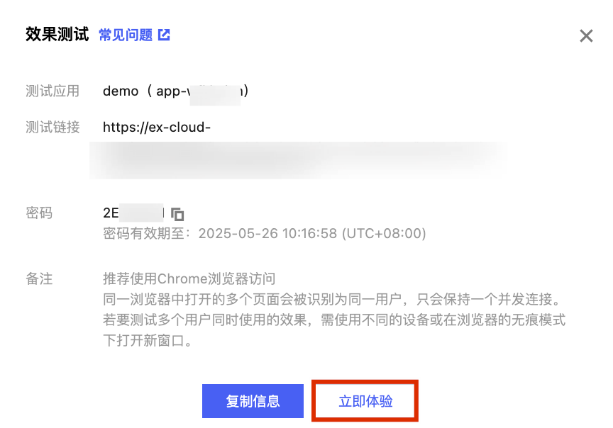 2. 在弹出的效果测试页面,单击立即体验。如下图所示: