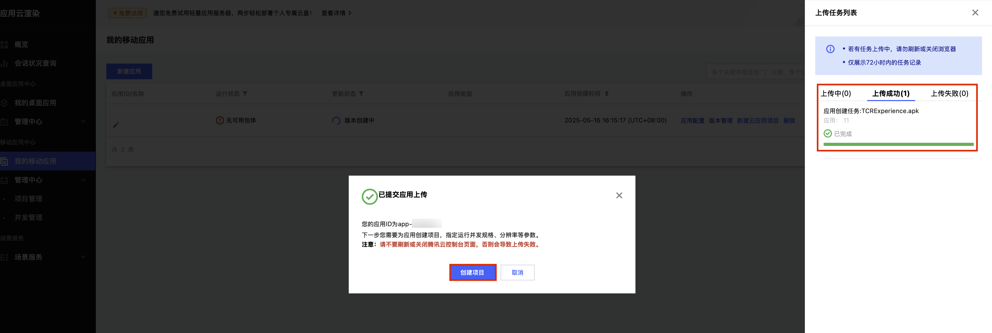 3. 提交应用上传后弹出窗口,可以选择根据指示直接单击创建项目为应用创建项目;或者单击取消,后续在项目管理页面为应用创建项目。本文档单击创建项目,如下图所示: