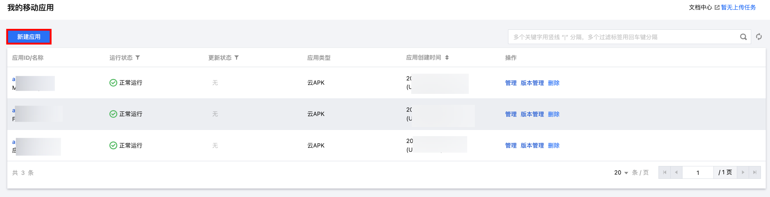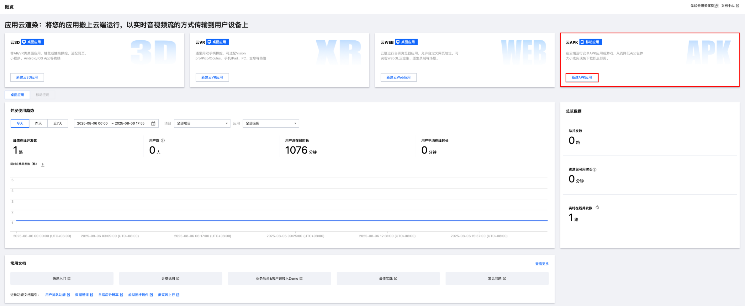 1. 在应用云渲染控制台 > 概览 页面,选择云 APK,单击新建APK 应用,如下图所示: