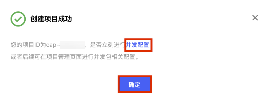 2. 创建项目成功页面,单击超链接并发配置进入并发绑定界面,或者单击确定,后续进行并发包相关配置。如下图所示: