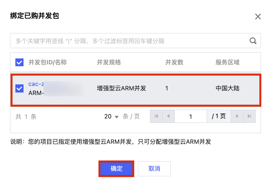3. 在绑定已购并发包窗口中,按照说明勾选指定并发包,单击确定,完成并发包绑定配置。如下图所示: