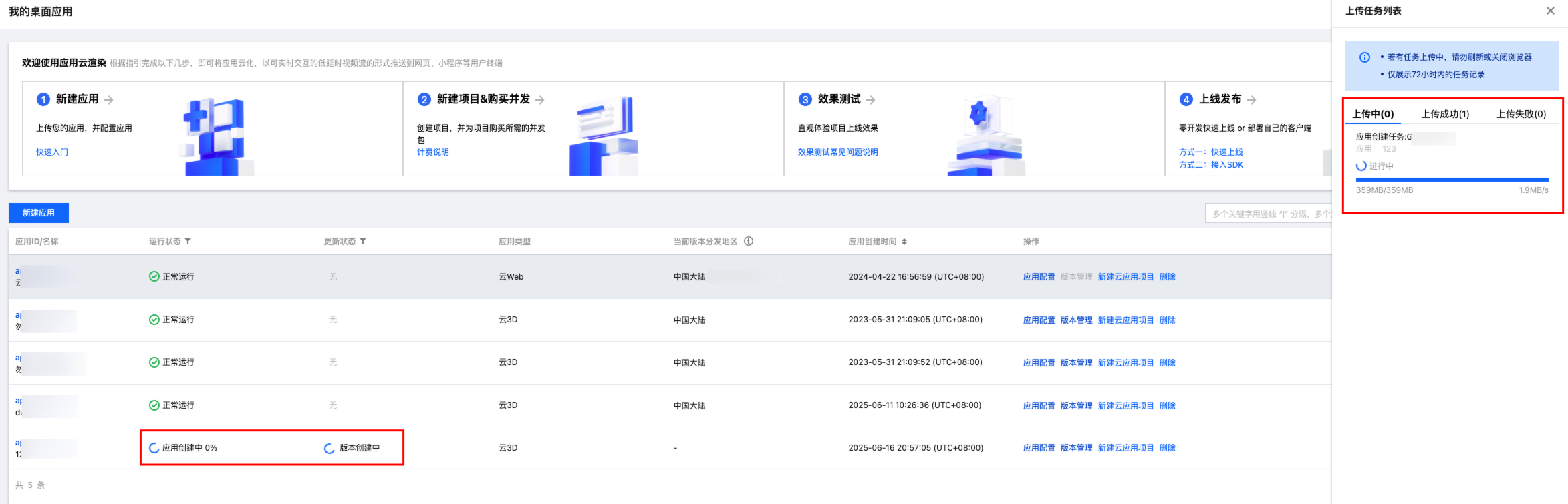 对于选择文件上传以及拖拽上传的应用,其上传进度可在右上角上传任务中查看。URL 上传为后台下载,可直接在我的应用表单内查看应用创建进度。