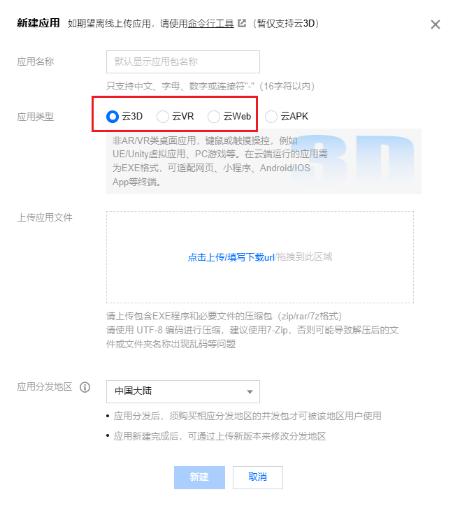 2. 在新建应用弹框中选择云3D、云VR 或云Web 的应用类型,上传方式支持选择文件上传、拖拽上传和填写 URL 上传。