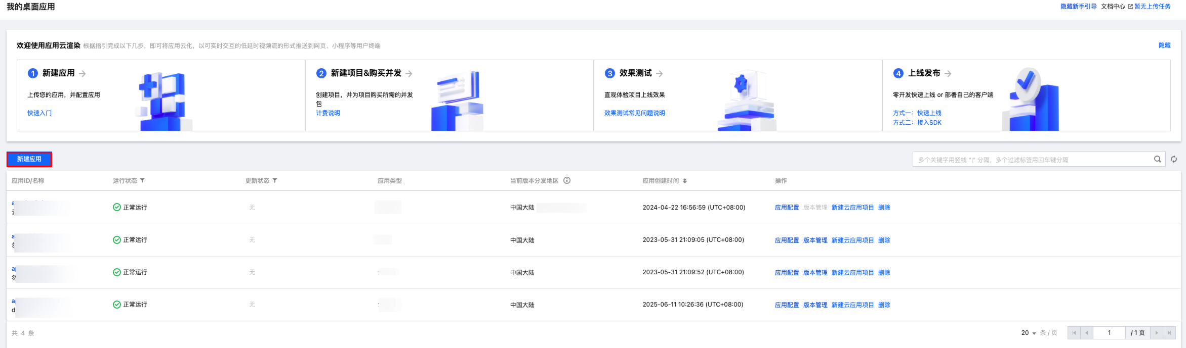 1. 进入应用云渲染控制台 > 我的桌面应用处单击新建应用。