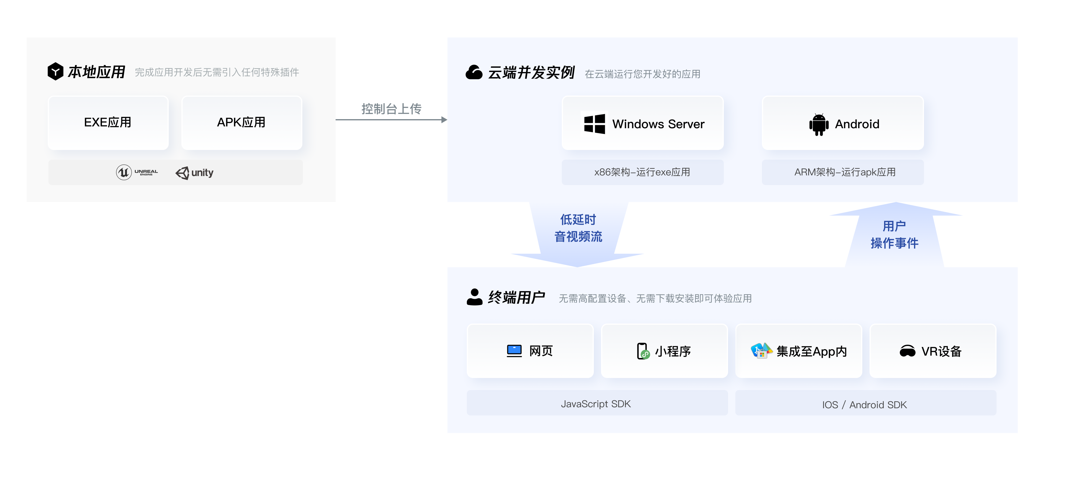 应用云渲染是一套整合了应用管理、并发资源管理与调度、音视频串流等能力的 PaaS 产品。它可以在云端并发实例上运行您开发好的应用 (EXE/APK 应用),终端用户无需下载应用包即可通过小程序、网页等体验应用。我们提供的终端 SDK 可将并发实例中渲染出来的音视频结果传输到终端,并将终端用户的操作实时发送给并发实例,您仅需确保应用可在 Windows Server 或 Android 环境正常运行,无需任何特殊插件即可轻松实现应用云化。