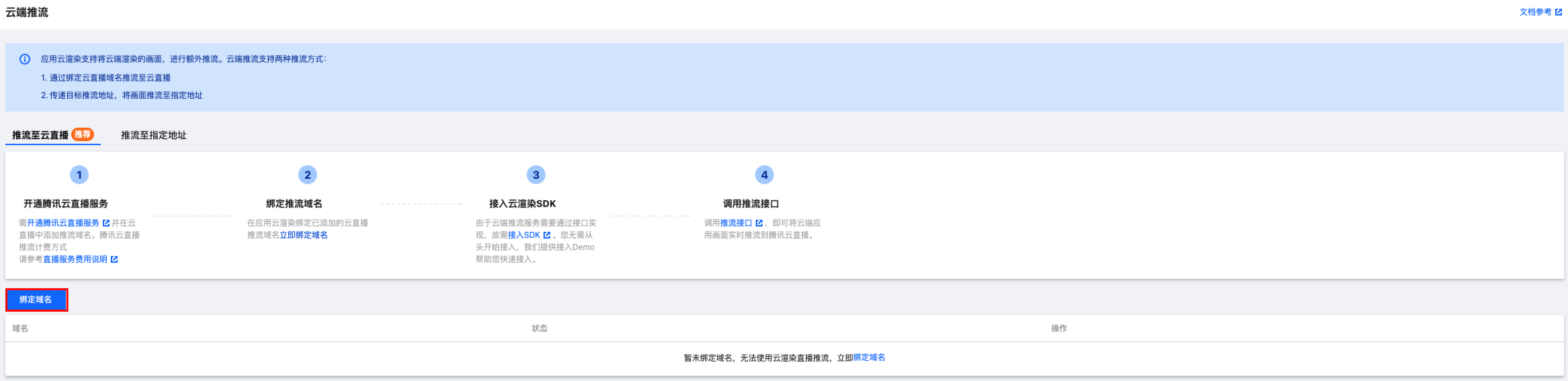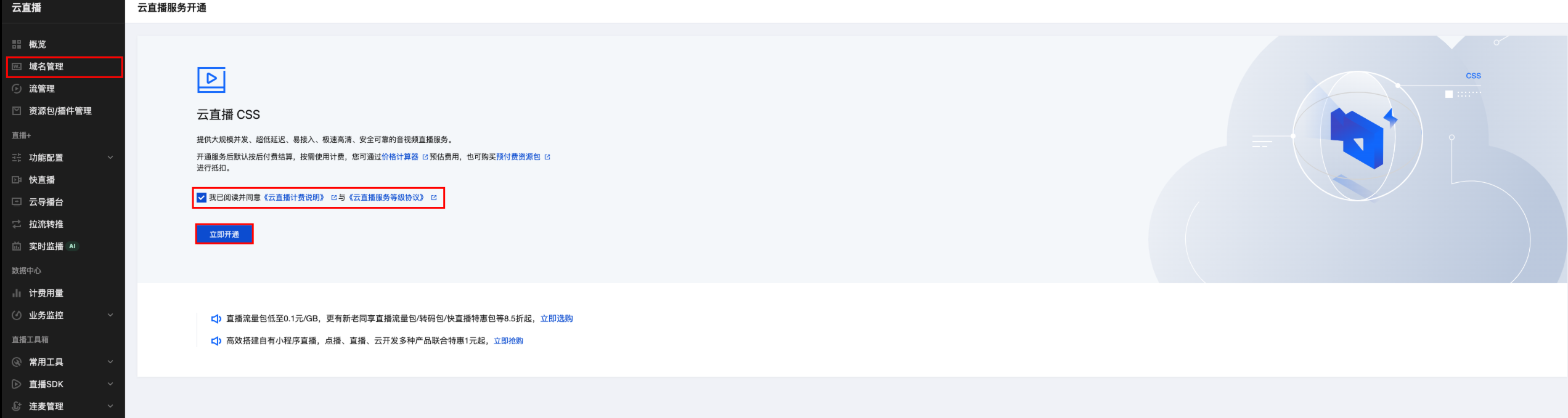 若未开通云直播,需要点击域名管理跳转云直播控制台,完成功能的开通。