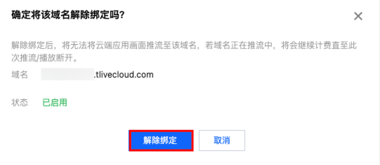 对已经绑定的直播推流域名,可执行解除绑定操作。