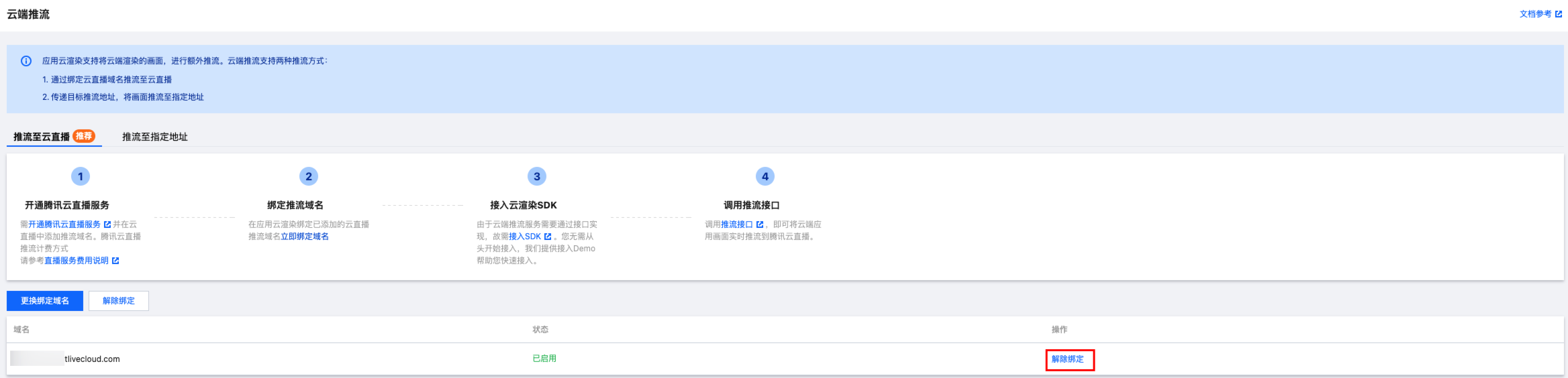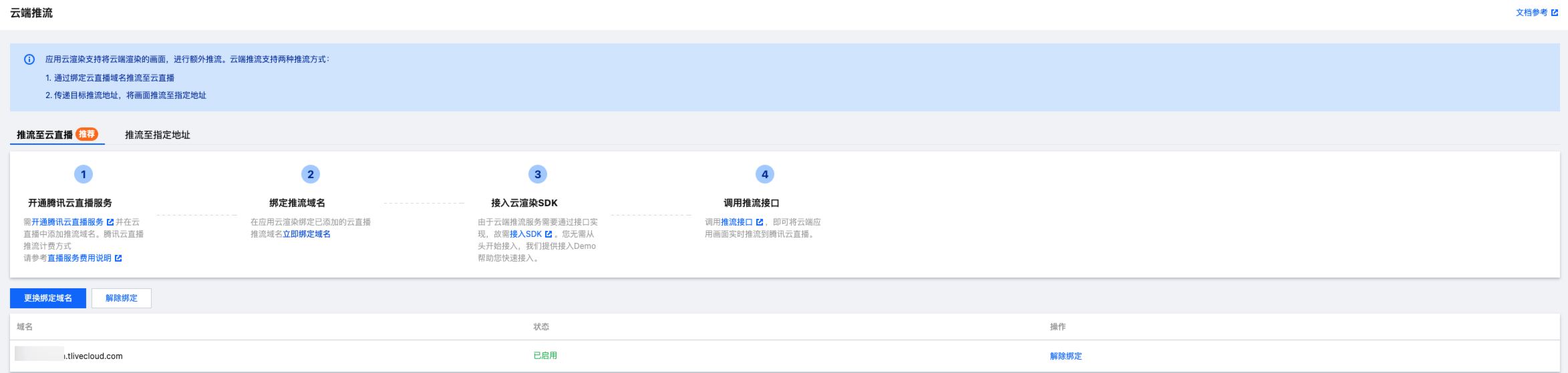 5. 绑定成功后,在应用云渲染控制台页面将会看到已绑定的推流域名。当前仅支持绑定一个推流域名,可单击更换绑定域名重新选择。