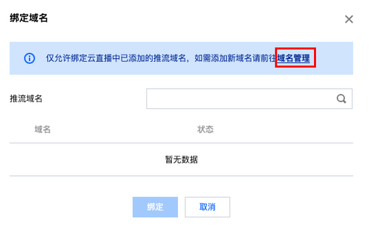 4. 单击绑定域名,选择云直播的推流域名,单击绑定进行确认。
