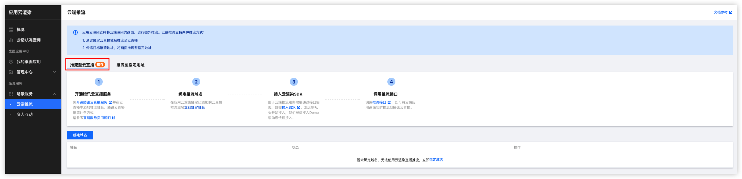 2. 单击左侧导航栏的场景服务 > 云端推流,选择推流至云直播页面。