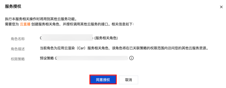 3. 在弹出的服务授权提示框中,单击同意授权。此操作是当您使用与云直播产品服务有关的功能时,需要授权调用云直播的接口。