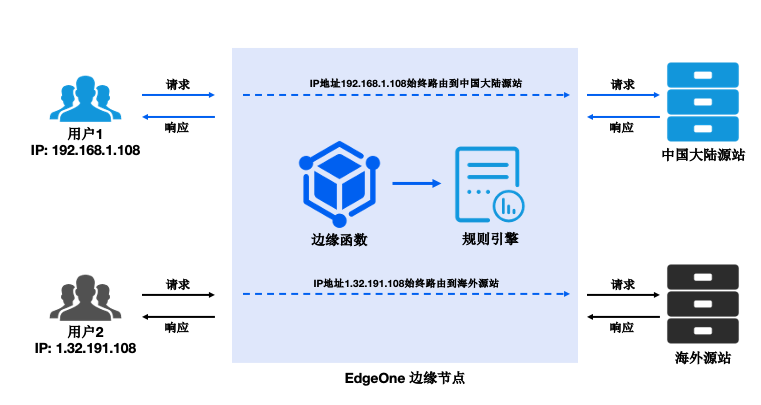 example.com 接入到 EdgeOne。您期望根据用户的 IP 地址的哈希值始终将请求路由到对应的源站,确保用户无论身处何地,同一用户的请求始终被路由到同一源站,有助于优化缓存效率、简化会话管理、实现负载均衡和提供个性化服务,并确保数据处理的合法合规。在这个场景中,您面对的是数百万不同的用户,这些用户的请求需要被均匀地分配到中国大陆的源站和新加坡的源站,同时您期望同一个 IP 地址的请求始终被路由到同一源站,以实现一致性的用户体验和高效的资源利用。在该示例中,将需要转发到中国大陆的源站的 IP 通过边缘函数增加一个回源请求头为: