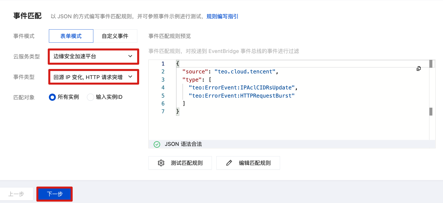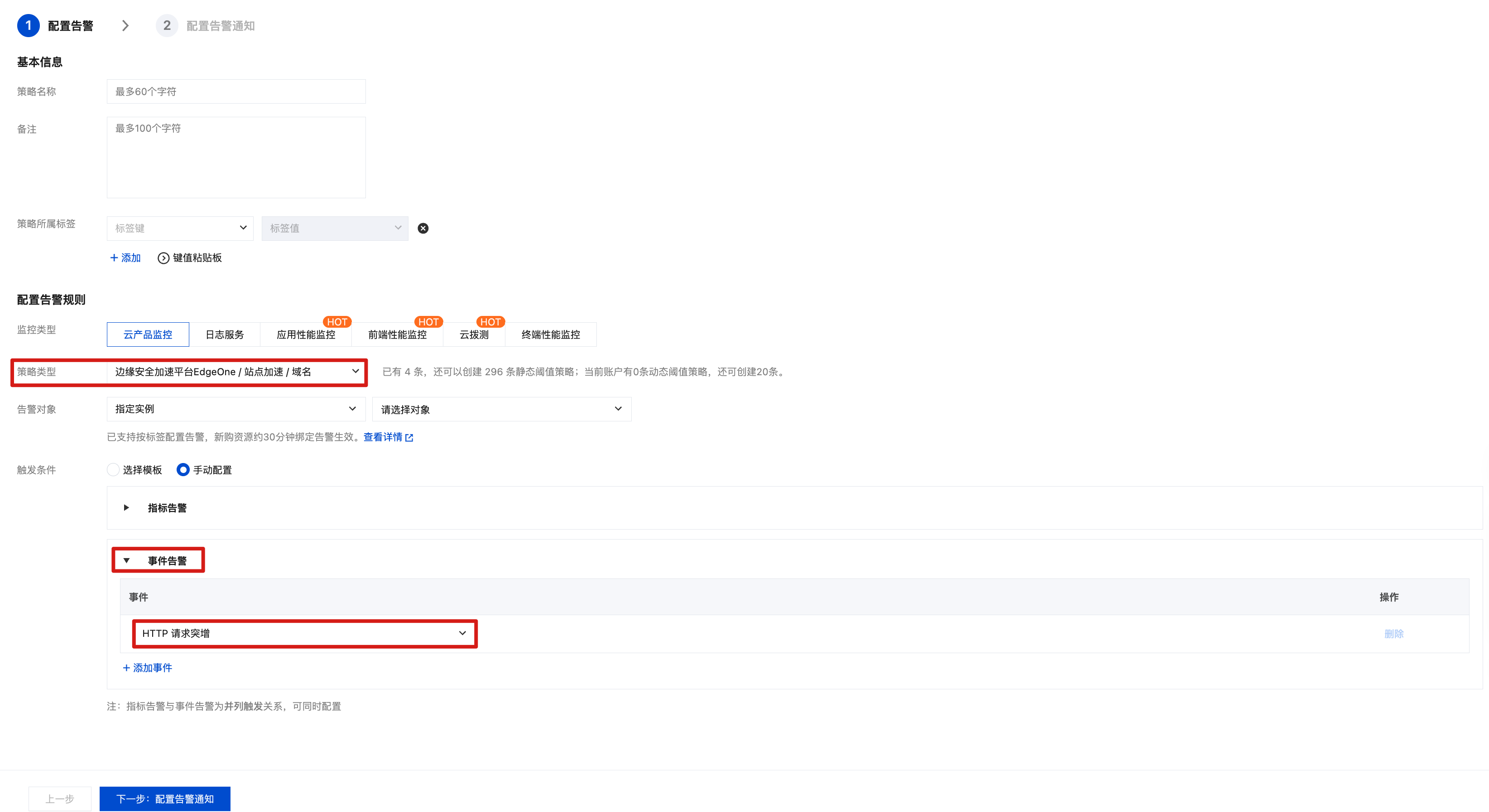 2.1 在事件匹配卡片中,选择云服务类型为边缘安全加速平台,事件类型选择期望配置告警的事件类型。