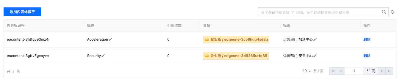 1. 新建内容标识符用于分别标识加速部门和安全部门所负责的域名,并对内容标识符关联标签。