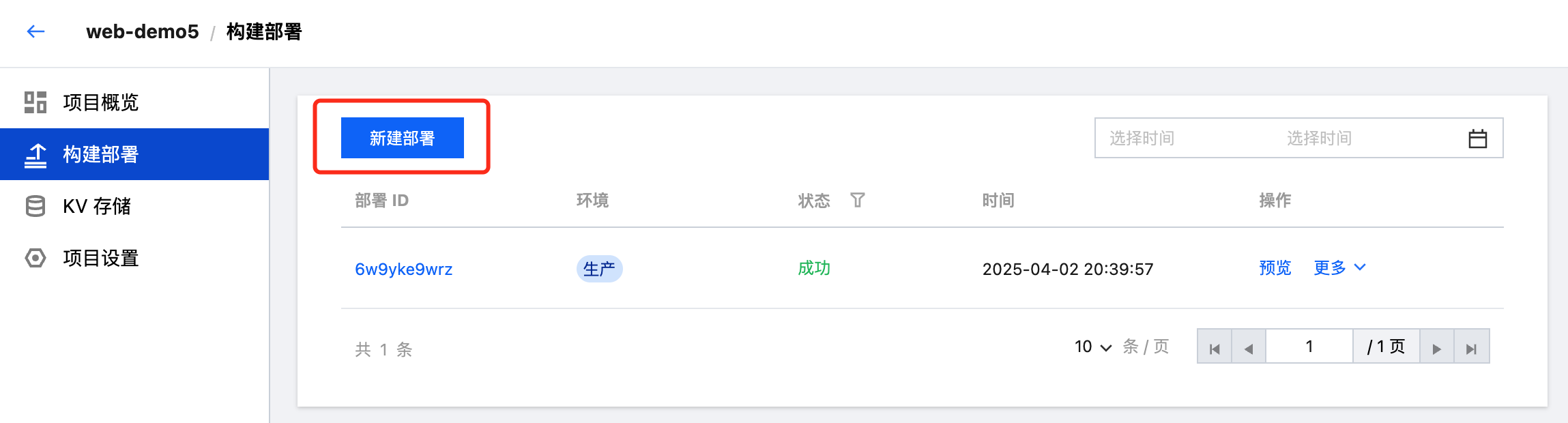 您可以通过在构建部署菜单内右上角的预览按钮生成部署预览链接,访问针对该版本的页面内容。