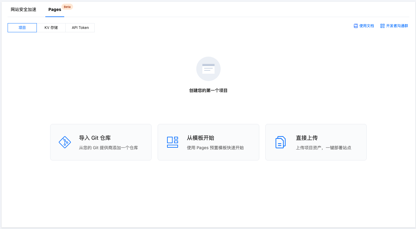 如果您当前是首次创建 Pages 项目,但是已有其他资源,可通过点击最上方的 Pages Tab,切换后在该 Tab 下选择创建 Pages 项目的方式。