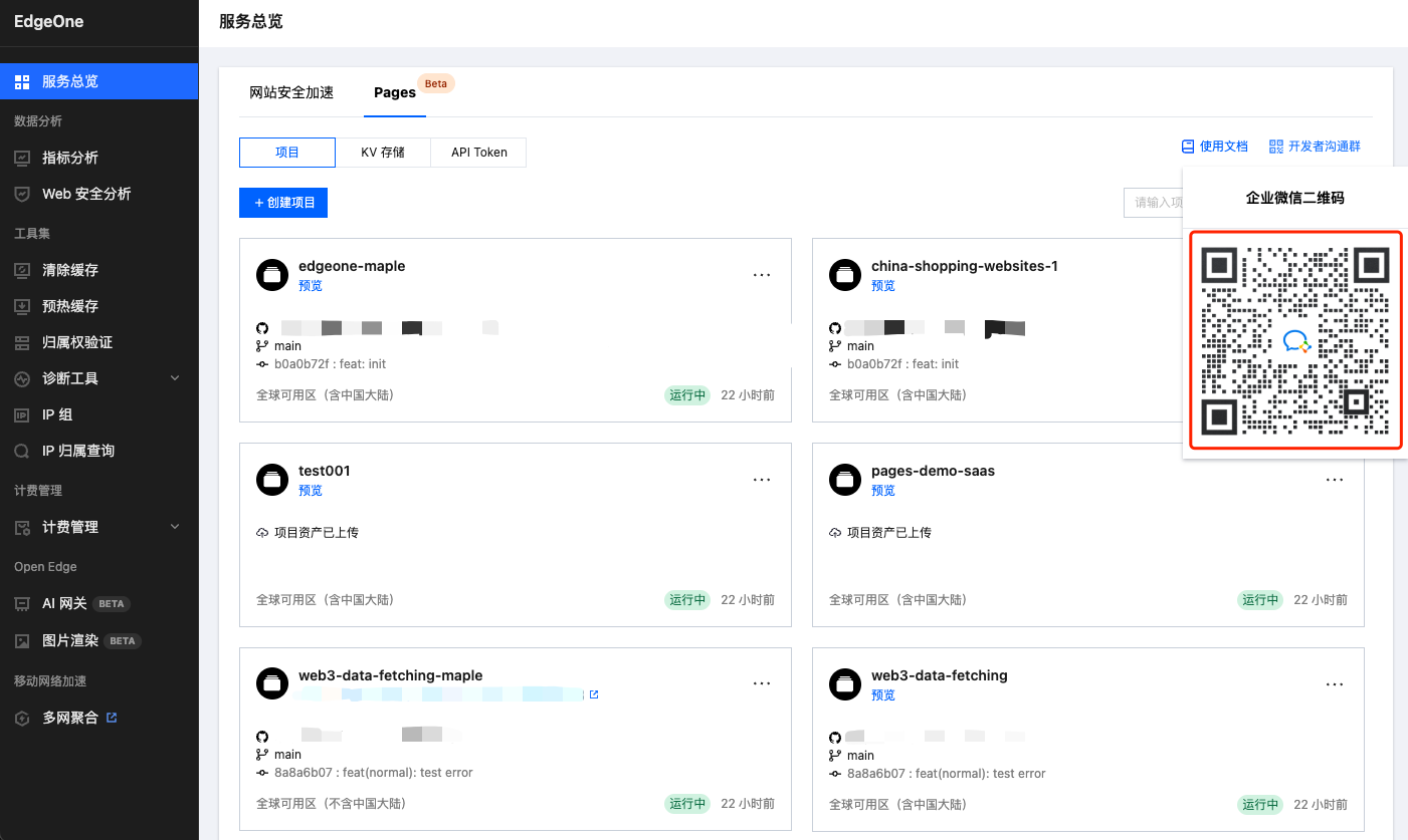 Pages 是基于 Tencent EdgeOne 基础设施打造的前端开发和部署平台,专为现代 Web 开发设计,帮助开发者快速构建、部署静态站点和无服务器应用。通过集成边缘函数能力,实现高效的内容交付和动态功能扩展,支持全球用户的快速访问。