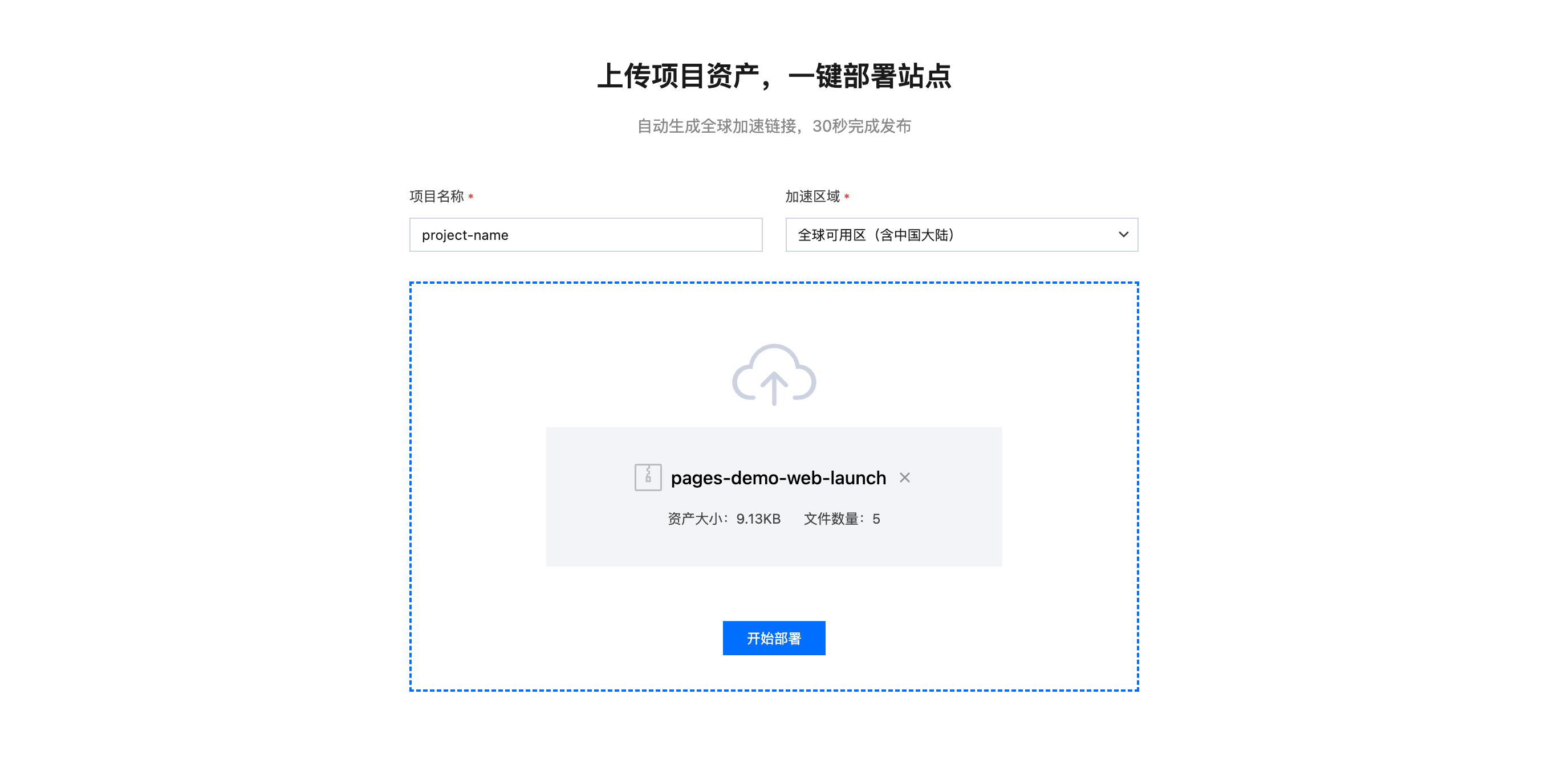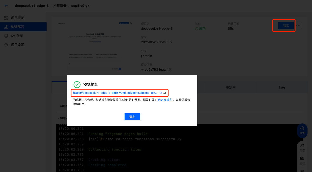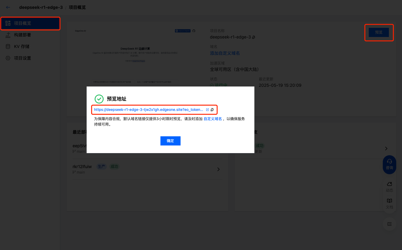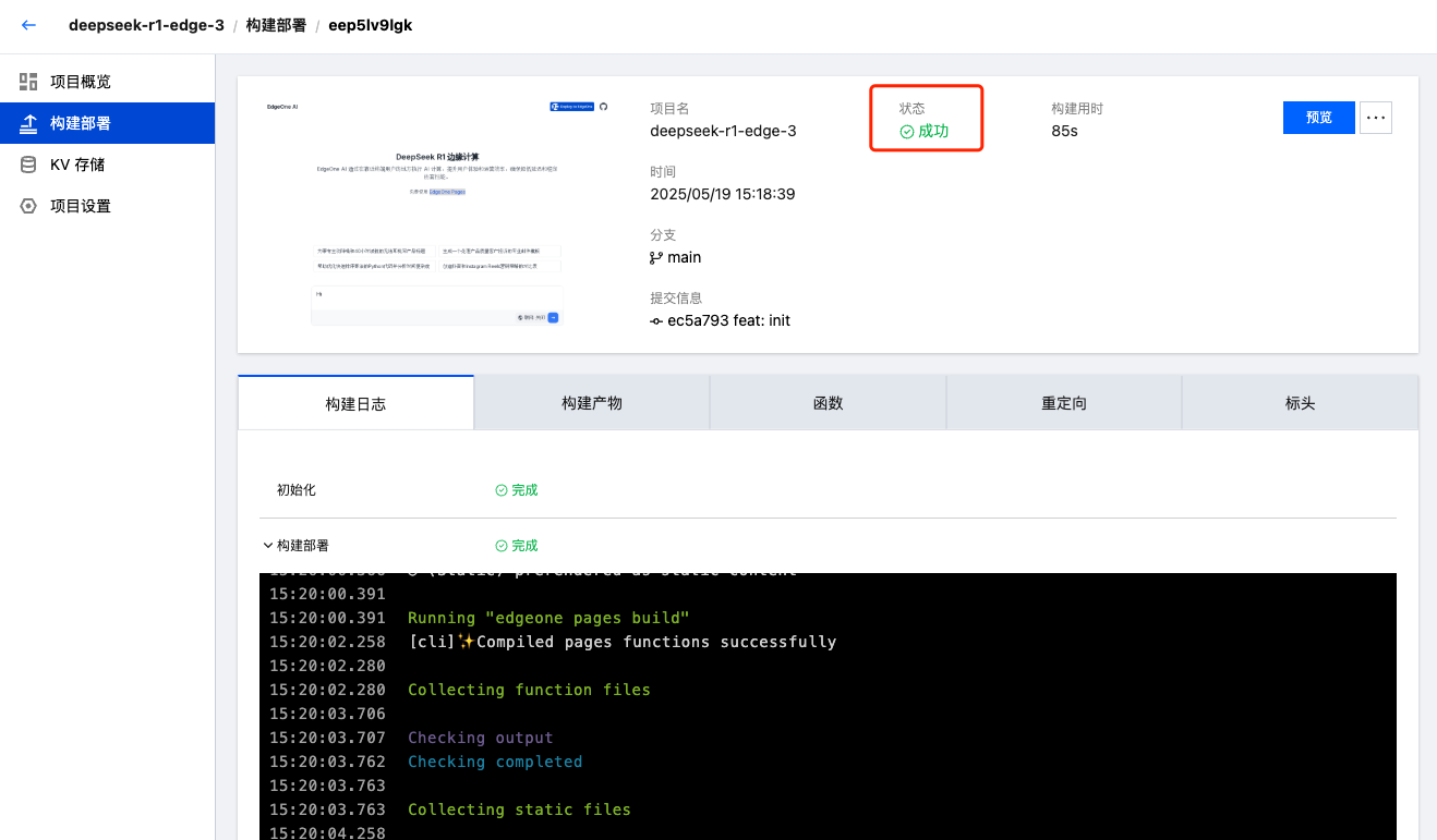 3. 点击开始部署,资产上传后会开始创建项目,随后跳转至部署详情页,待部署成功后,您可以通过预览链接查看项目验证生效状态。