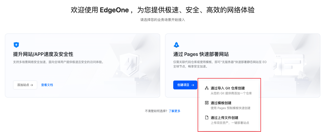 如果您是首次登录控制台,或者当前在 EdgeOne 内没有任何资源,则会进入场景选择大厅,在此界面内,鼠标移动至创建项目,可选通过“导入 Git 仓库”、“从模板开始”或“直接上传”三种方式来创建项目。