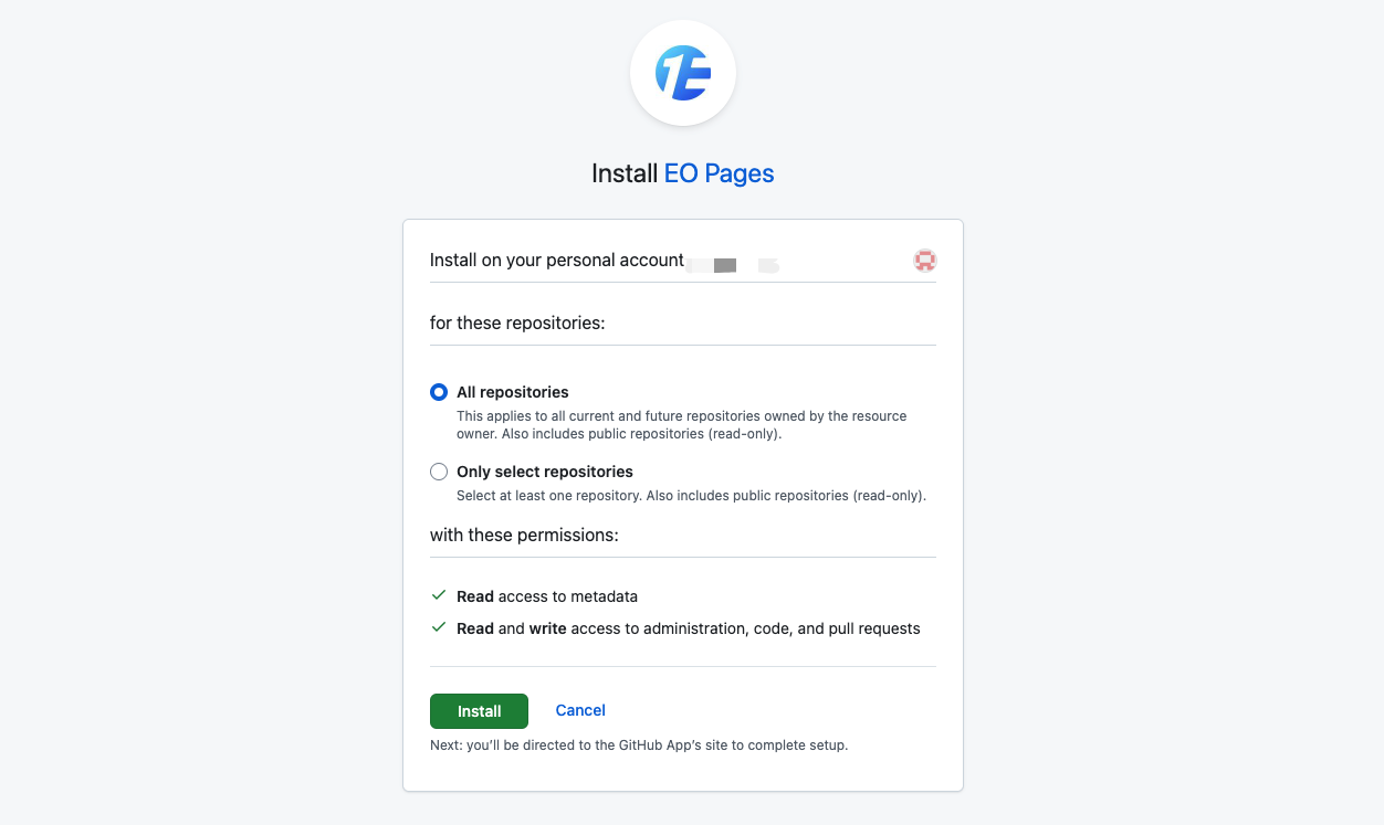 3.选择您要部署的仓库或授权所有仓库,点击 Install。
