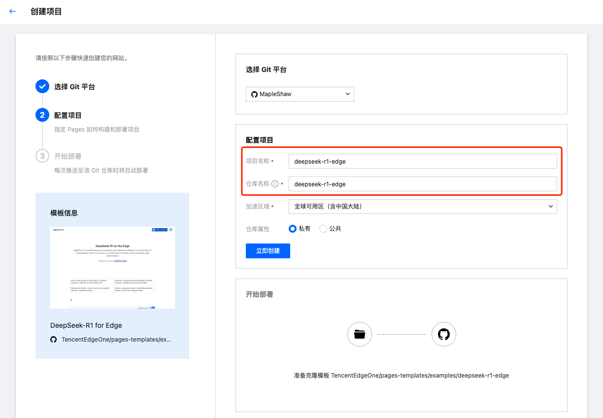 2. 设置项目名称及仓库名称,亦可调整仓库属性。选择加速区域时,不同的区域决定了项目分配的节点资源,以及添加自定义域名的时候是否需要备案,详情可参考 域名管理 - 加速区域。