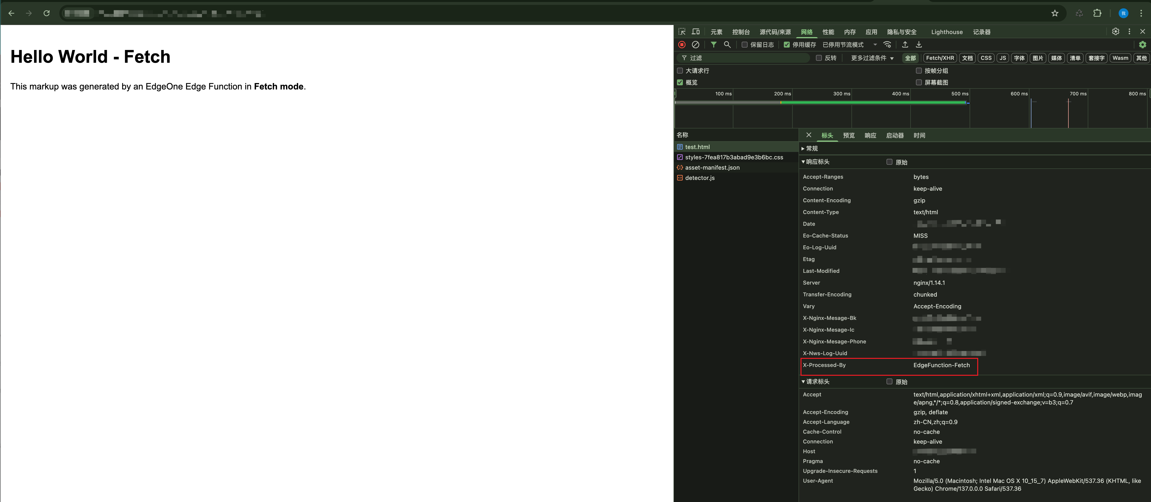 Fetch 方式允许您完全控制请求和响应内容,适合需要定制化处理的场景。当用户请求到达边缘节点时,边缘函数可以识别用户的设备类型、地理位置等信息,并在回源请求中添加相应的自定义头部发送到源站。源站根据这些信息返回相应的响应内容后,边缘函数还可以对源站响应进行进一步处理,如添加自定义响应头部、修改响应体等,最终将处理后的响应返回给客户端。
