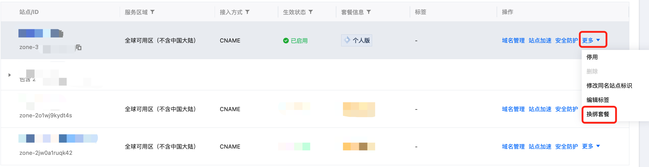 1. 前往 EdgeOne 控制台 > 服务总览,选择需要换绑套餐的站点,单击更多,选择换绑套餐。