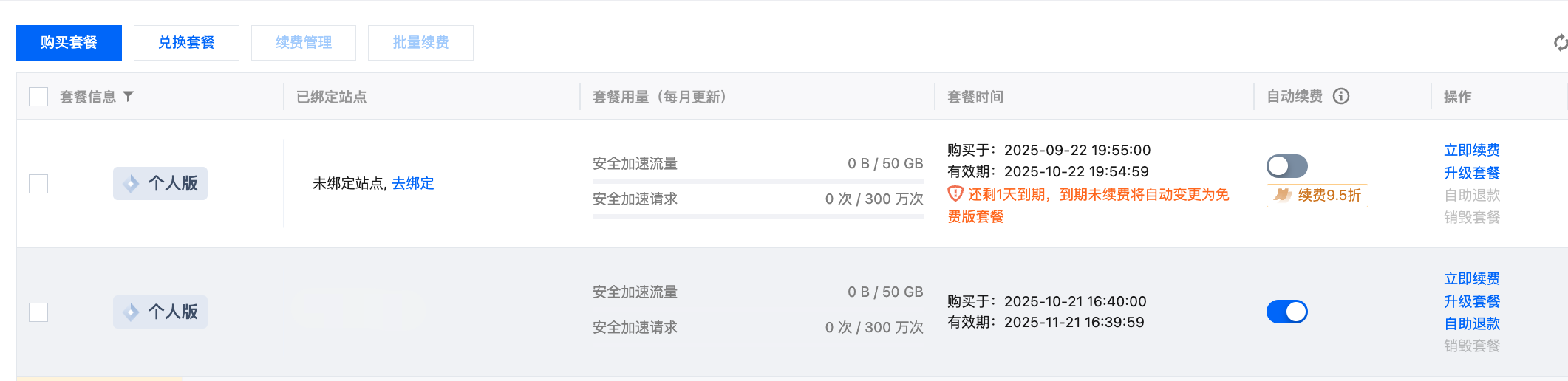 当您正在使用的套餐即将过期,而账户下又存在其他空闲的套餐时,可通过套餐换绑将站点平滑无损地换绑切换到其他套餐。本文主要介绍套餐换绑的操作步骤。