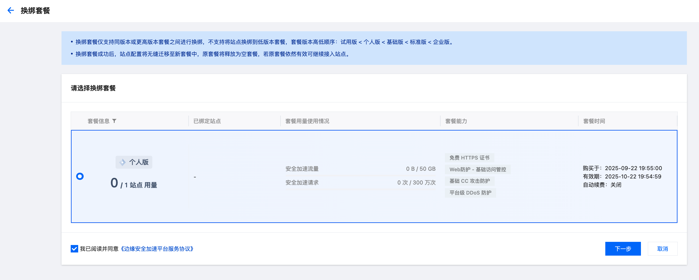 2. 进入选择套餐页面,该页面将展示所有可以换绑的套餐,选择您需要换绑的套餐,勾选同意服务协议。