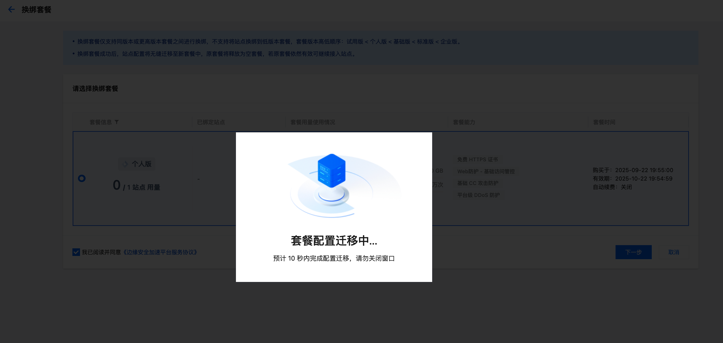 换绑套餐成功后,站点配置将无缝迁移至新套餐中,原套餐将释放为空套餐,若原套餐依然有效可继续接入站点。