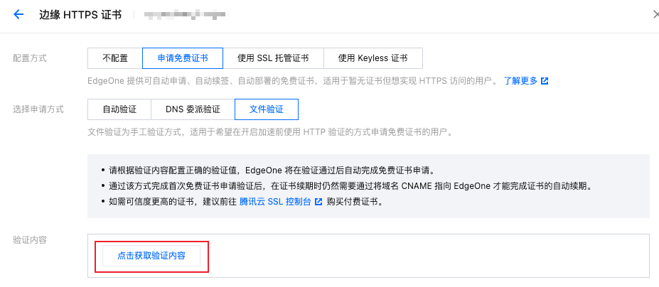 5. 选择配置方式为申请免费证书,验证方式选择为文件验证,点击获取验证内容。