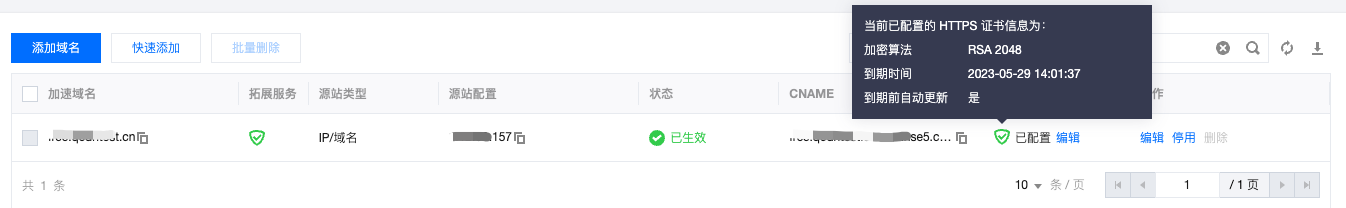 7. 等待域名 CNAME 生效,免费证书将在 CA 机构签发证书后自动完成部署。部署完成后,重新进入 HTTPS 配置界面,即可查看当前的证书状态为已配置。