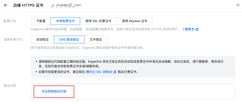 5. 选择配置方式为申请免费证书,验证方式选择为 DNS 委派验证,点击获取验证内容。